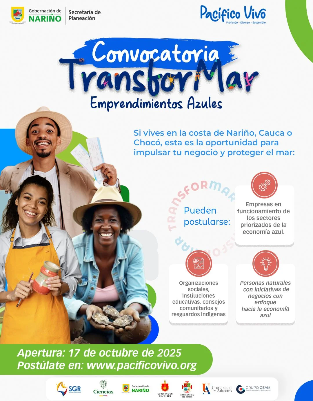 El programa TransforMAR emprendimientos azules – Pacífico Vivo abre su convocatoria para identificar y fortalecer iniciativas empresariales en los territorios costeros de Nariño, Cauca y Chocó. Si sueñas con un negocio que contribuya al desarrollo sostenible de tu comunidad desde la economía azul, esta es tu oportunidad.