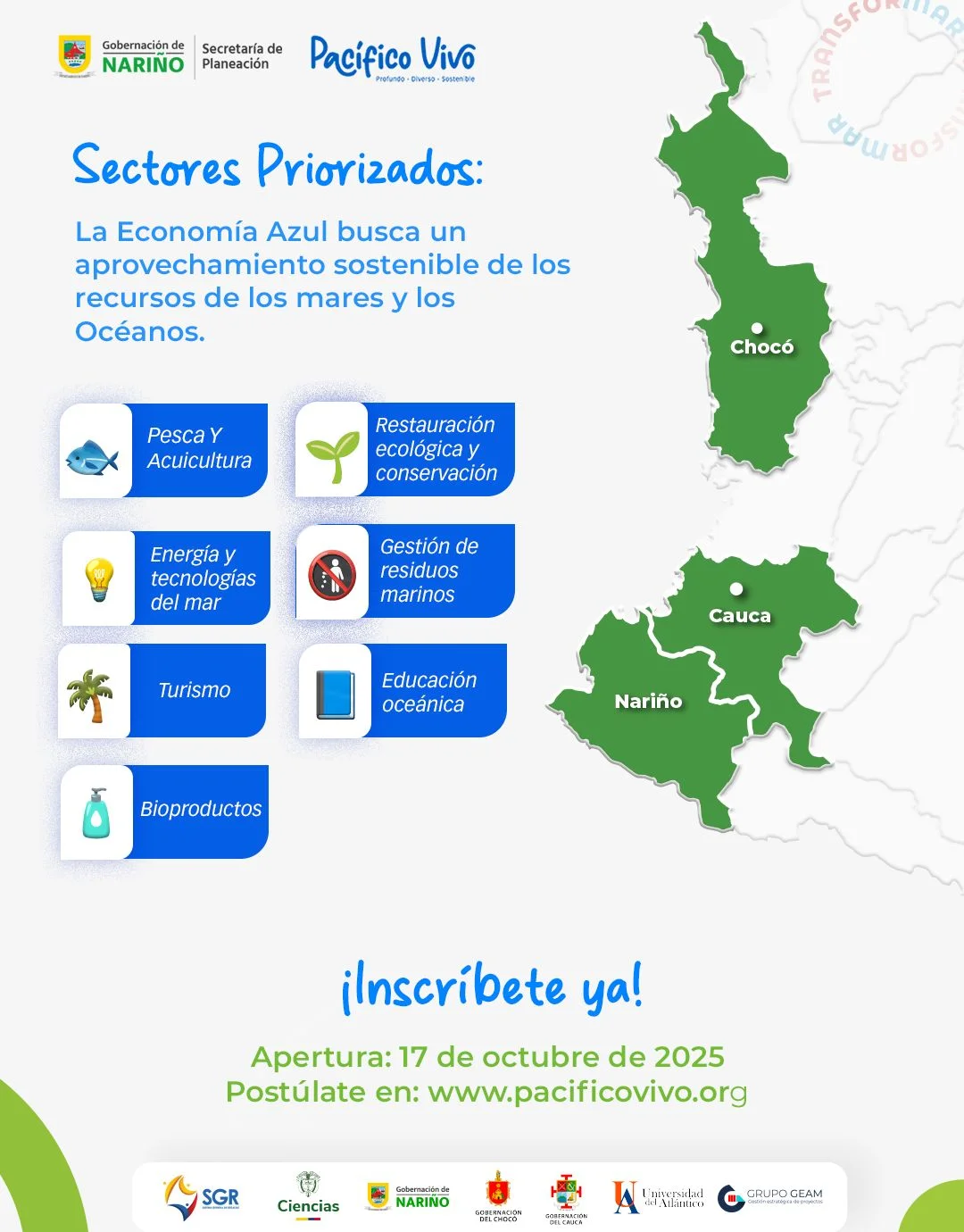 Gobernación de Nariño, en alianza con entidades locales del Pacífico colombiano, en el marco del proyecto Pacífico Vivo y financiado por el Sistema General de Regalías. Conozca aqui – Programa de Economía Azul – Términos de referencia y el programa de fortalecimiento.